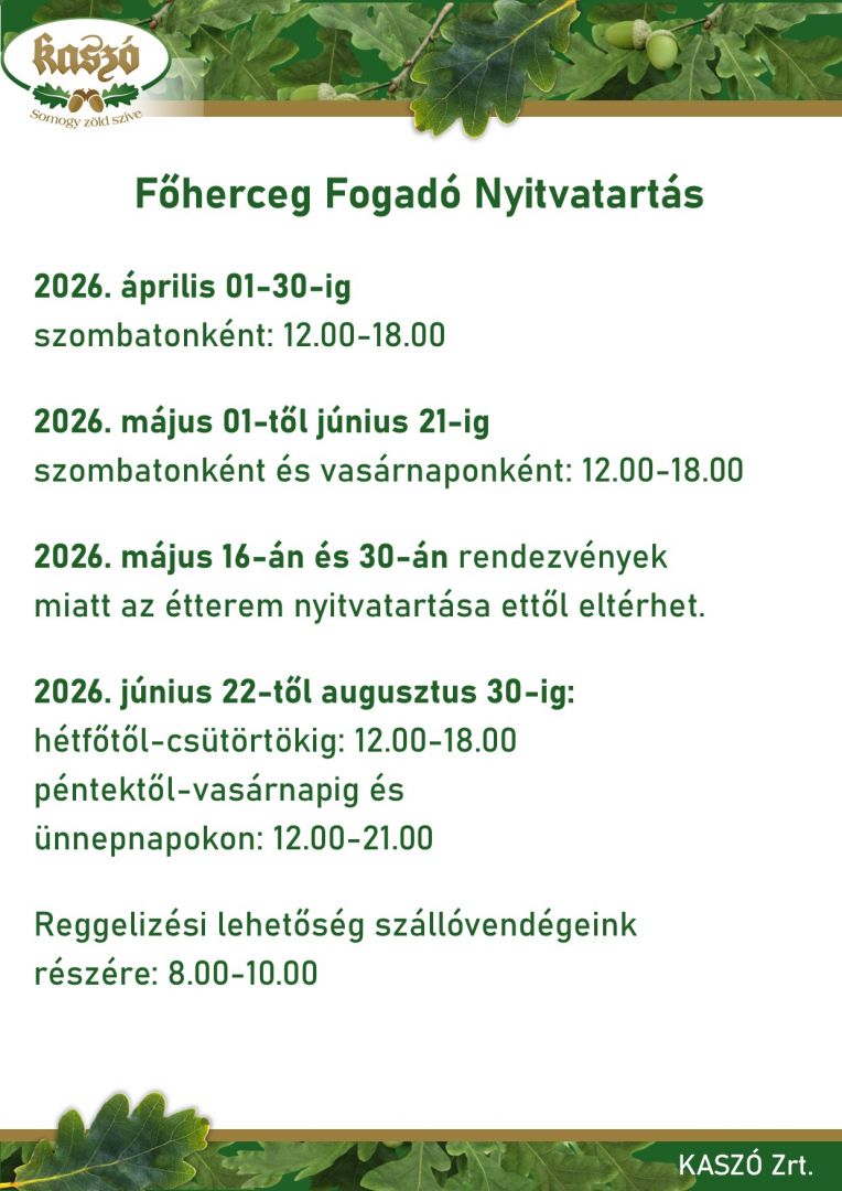 Főherceg Fogadó 2026. nyitvatartása